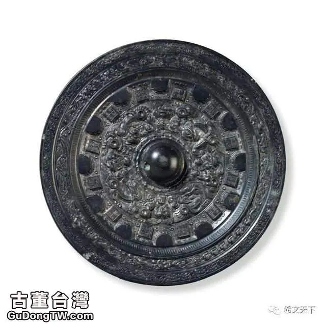 中國,東漢中後期,公元2世紀末至3世紀的青銅圓形鏡子,有神靈和動物。直徑(14厘米)。