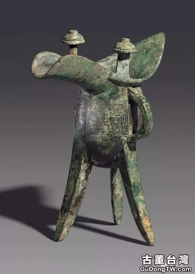爵:古老的儀式青銅組件中最引人注目的酒器之一(上圖) – 另一種儀式酒器,有一個出酒的口,螺旋蓋柱,喇叭尾和長三腳架腿。