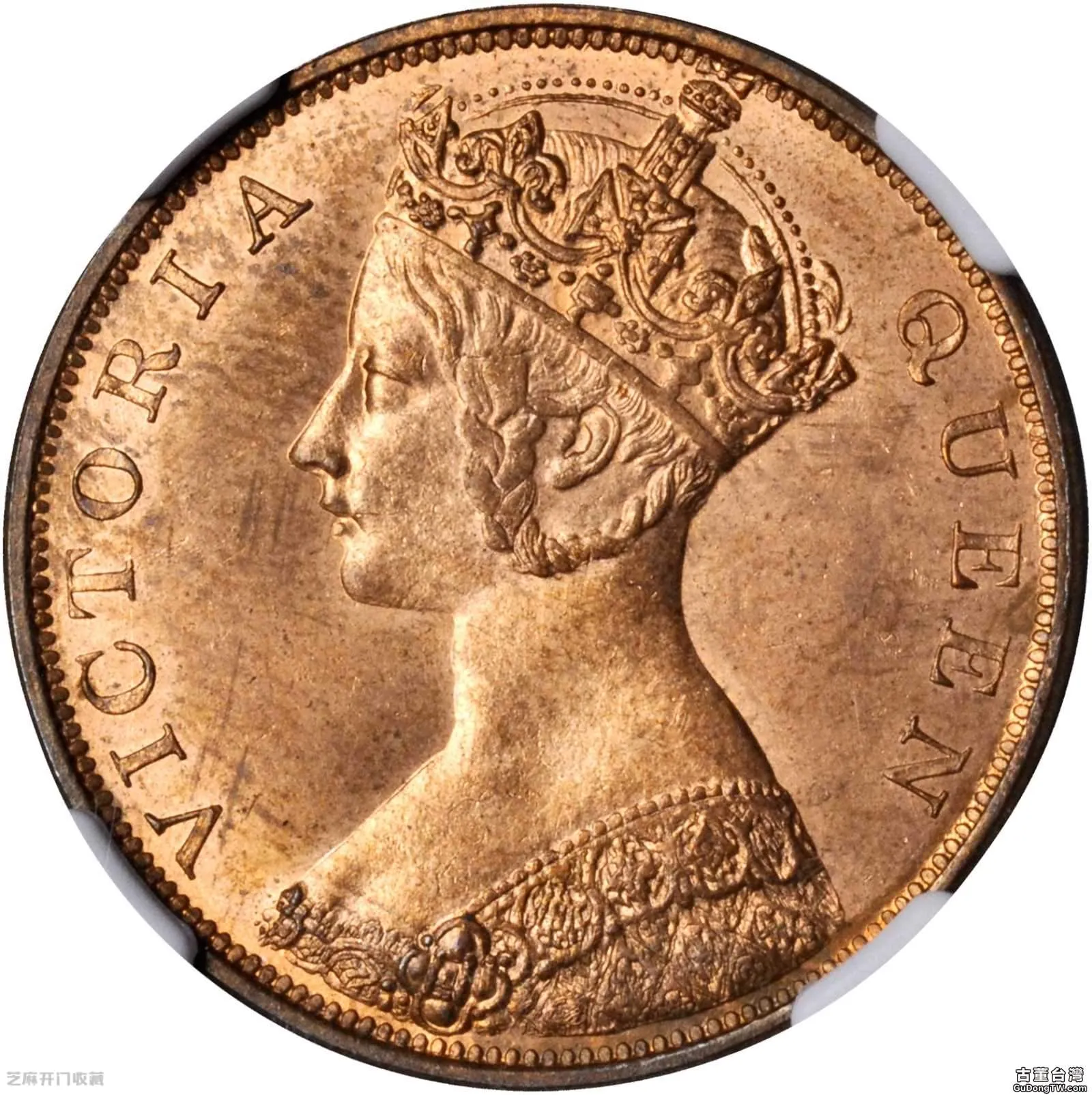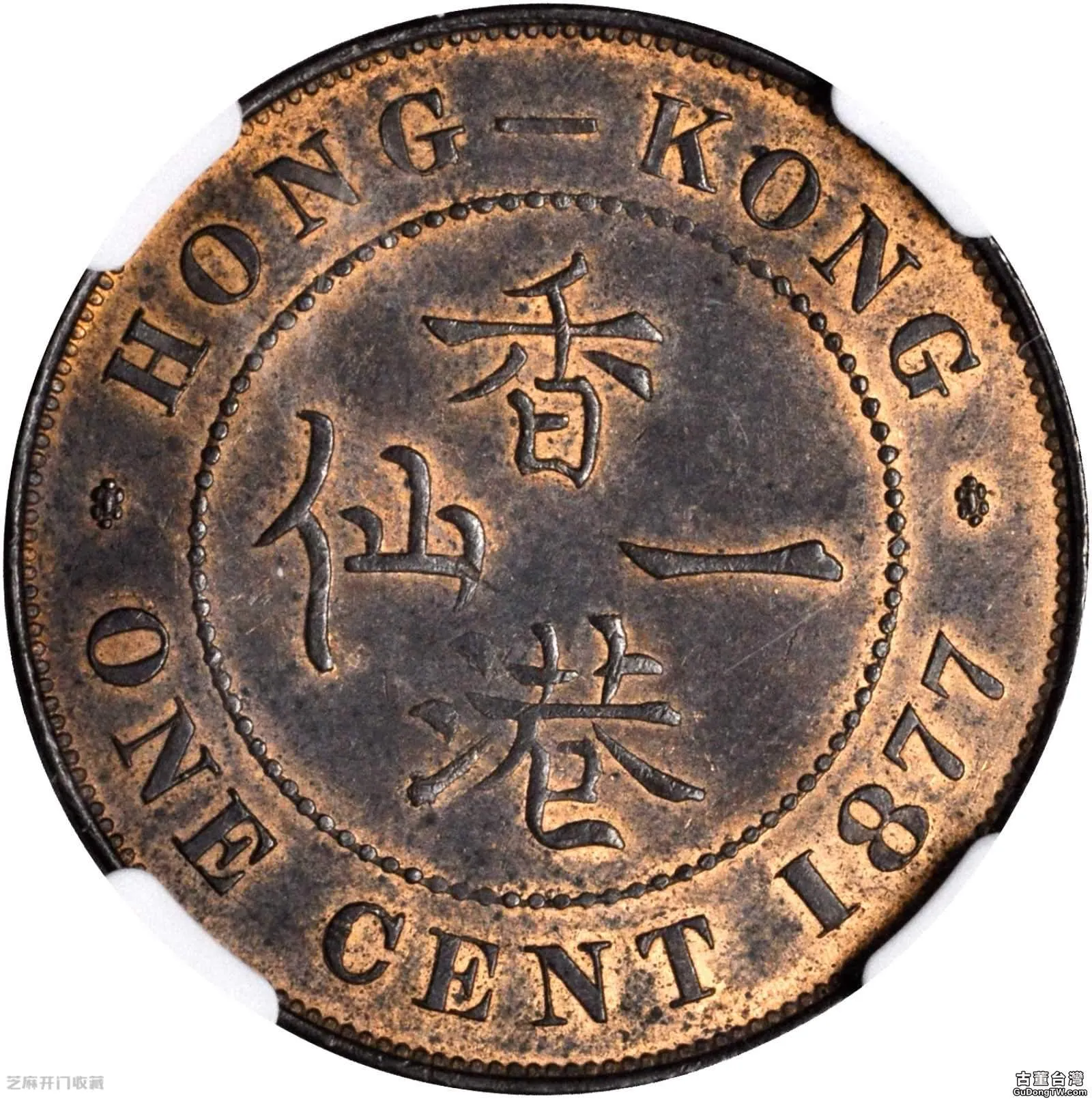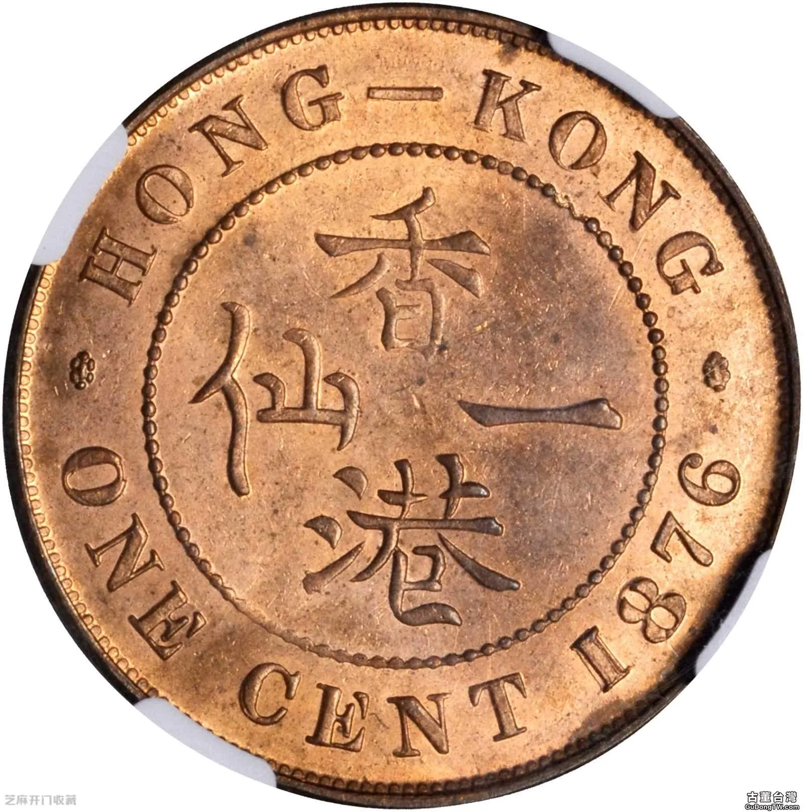 2:1876年香港一仙。 SBP2017年4月香港-港澳錢幣 機制幣 古錢 銀錠,估價: USD 350 – 500,成交價格:USD 2271,成交時間: 2017-04-04 20:00:00。1876年香港一仙。HONGKONG.Cent,1876.NGCMS-65RD.熾烈橘紅色表面,原光,鑄打清晰,細節完善,少許碰痕是唯一的流通痕跡。評分最高,僅有1枚同款獲相同評分。NGCMS-65RD.