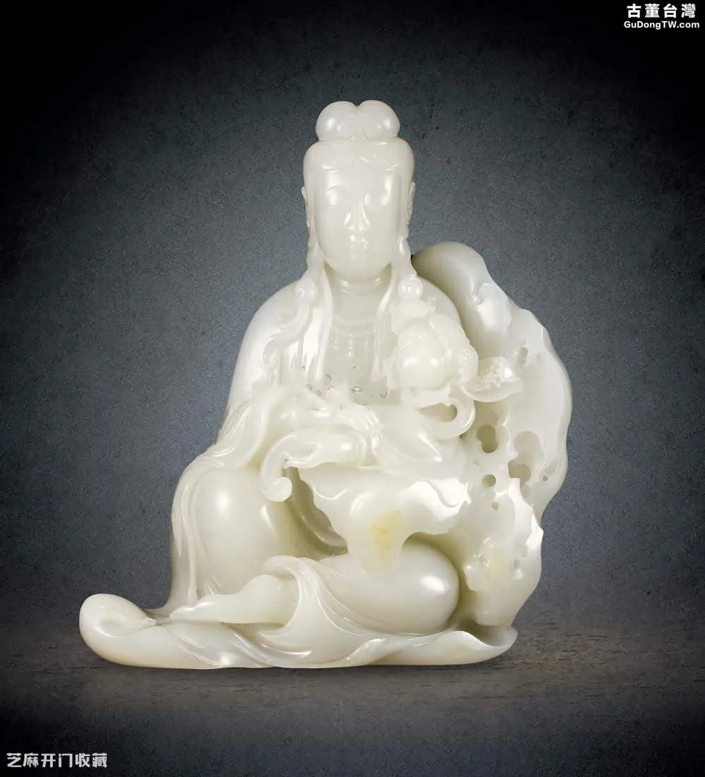 觀音在藏傳佛中最受尊崇,因救苦救難,故受百姓喜愛,以其為題材的藝術品至今不衰。此間白玉觀音,選用新疆和田金皮資料,玉質溫潤細膩,取整料雕琢而成,器形厚重,體量較大。