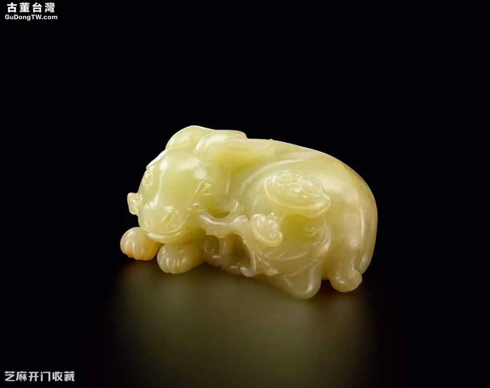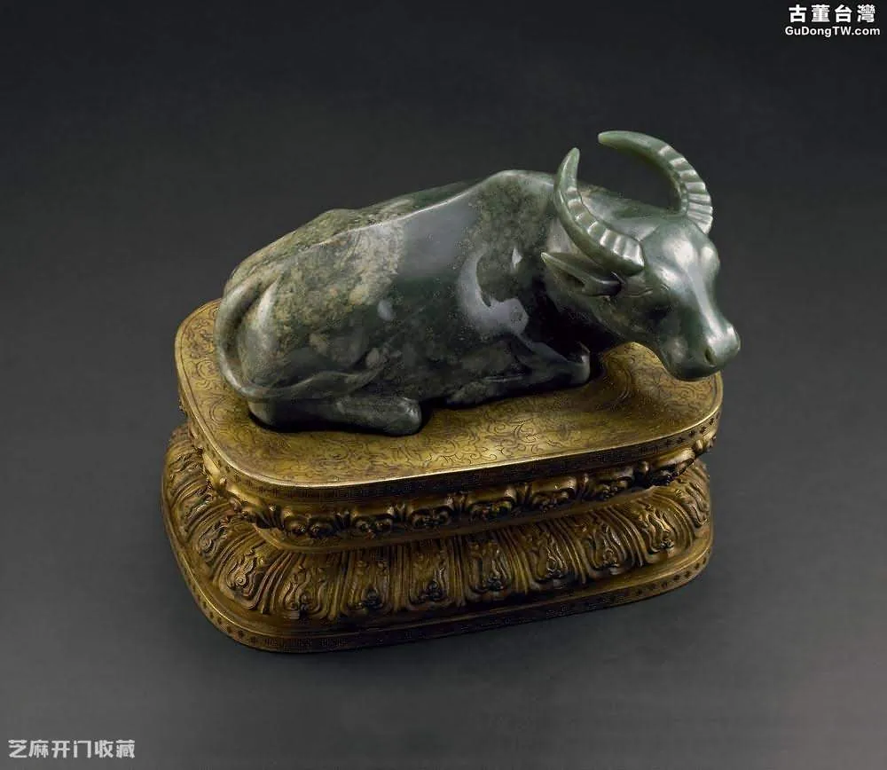 碧玉內蘊深沉,玉質中滲透著日月之精華,正是碧玉的這種穩重與莊穆,博得了乾隆帝的喜愛。此件碧玉琢製成一頭健壯的臥牛,其身體呈側臥狀,頭部略微側轉,以一種寫實的技法,琢磨而成。由於中國長期處於農耕時代,農耕中牛扮演著最為主要的角色,因此古人對於牛有著特殊的感情。而牛溫順、勤勞的品性,也一直被古人加以褒揚,甚至以牛作為主題編撰一些神話故事。而後牛也成為了常見的一類藝術題材,各種古詩文及藝術品中均可以見到牛的形象。此件臥牛,依據各部分特點的需求,入刀深淺不一,達到了一種真實的效果與狀態。首先,牛兒面相的刻劃沉靜,不露聲色,有靜穆之感。其次,底部四蹄的刻劃也是細緻入微,並無偷工之處。背部脊柱隆起,清晰可見,身體的肌肉飽滿,以玉面略微的凹凸來表現,十分到位。下面的銅鎏金座,為圓角長方形束腰座。座頂部有纏枝花卉的圖案,四個凹槽,分別與臥牛四蹄相切合,側面有雲雷紋飾一周,配高浮雕紋樣,紋飾細膩,收放自如,雖複雜但不冗繁。銅鎏金的製作工藝使得器物古樸凝重,別具一番悠遠的意味。底部刻有「大清乾隆年製」的字樣。整體構思精巧,雕琢工藝精湛,乃是一件十分難得的宮廷原配器座。整個器物組合,可謂博古通今,融合玉雕,鎏金等多門工藝於一身,取義吉祥康健,以碧牛為鎮宅之寶,必定萬事亨通,門庭顯耀。配以銅鎏金座,可謂金玉良緣,佳偶天成。