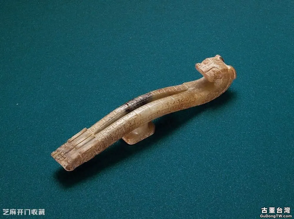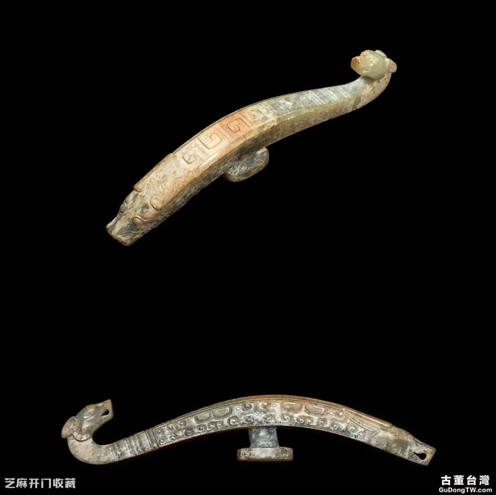 帶鉤,是古代貴族和文人武士所繫腰帶的掛鉤,古又稱「犀比」。多用青銅鑄造,也有用黃金、白銀、鐵、玉等製成,是身份地位的象徵,尤其王公貴族、社會名流所用帶鉤甚為精美。帶鉤起源於西周,戰國至秦漢廣為流行。歷史上龍首帶鉤的流行主要在兩個時期,一是戰國至漢代,二是元明清時期。戰國早期龍首帶鉤首高昂,龍首略似馬首,僅具輪廓,不刻五官。發展到中晚期,龍首稜角分明,嘴巴短寬,眼圓外凸,背面較平。從此帶鉤的形制推斷當為戰國中晚期典型的龍首玉帶鉤器。此帶鉤構思巧妙,鉤首、鉤尾均作龍首,首尾呼應,且鉤身滿飾紋飾,紋飾層次豐富,包漿幽古,彌足珍貴。