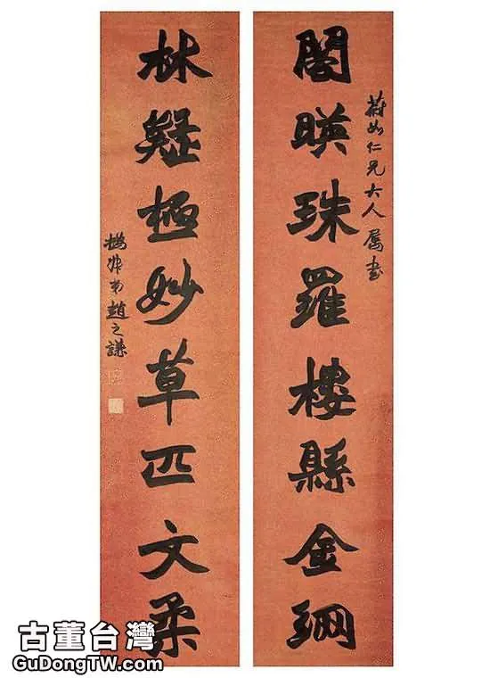 隸書八言聯,為作者41歲時所書。款屬“受恬九兄學書於鐵客,能具懷寧之體而兼涉其敝,頃屬書聯,因變格為之。同治己巳(1869)三月,趙之謙倚裝作”