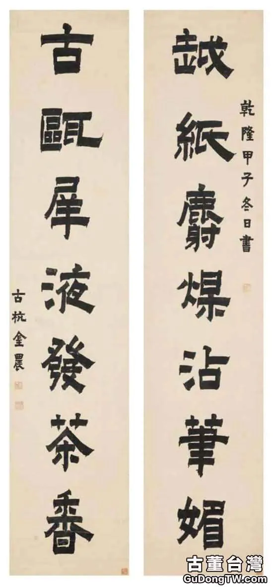 金農 隸書七言聯 《越紙麝煤沾筆媚 古甌犀液發茶香》