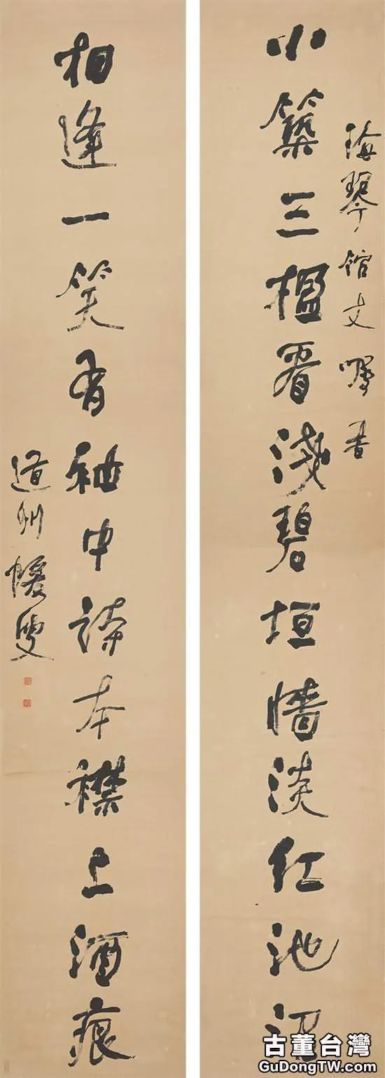 劉墉之作初看粗率拙鈍、信手而為,然細細推敲之下,方見得他的大智若愚、文冠武略式的另番高明。尤其是劉墉善用裹鋒的運筆之道,更使他的創作別具妙處。包世臣對劉氏書作多有贊評,他說“文清少習香光,壯遷坡老,七十以後潛心北朝碑版。雖精力已衰,未能深造,然意興學識,超然塵外”,“然其筆法則以搭鋒養勢,以折鋒取姿。墨法則以濃用拙,以燥用巧。結法則打疊點畫,放寬一角,使白黑相當,枯潤互映,以作插花援鏡之致。捲簾一顧,目成萬態”。從實物看,劉氏書法確具以上特點,特別在筆法和墨法上,信通常技巧手段猶不能作同日語。此中,“客過茅蓬非率爾,詩如錦繡益飄然”,行書七言聯,為其最具典型風格的作品之一。