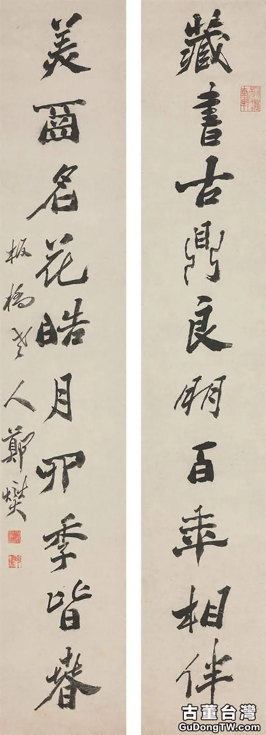 又上博藏品“藏書古鼎良朋百年相伴,美酒名花皓月四季皆春”行書十言聯,為鄭燮書法的典型之作。但見運筆跌宕起伏,筆道剛勁恣肆。結字形體多變,似正而奇,每顯姿態,此間,尤其通篇由諸體參合而起的變化莫測、新意迭出的一派金石意味,洵為難得。