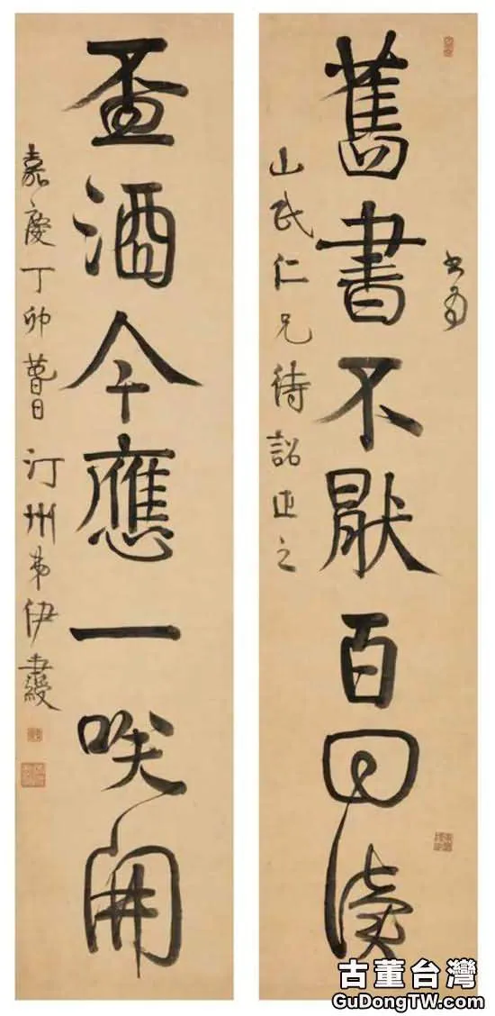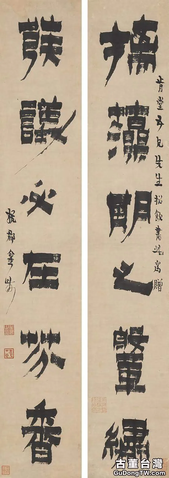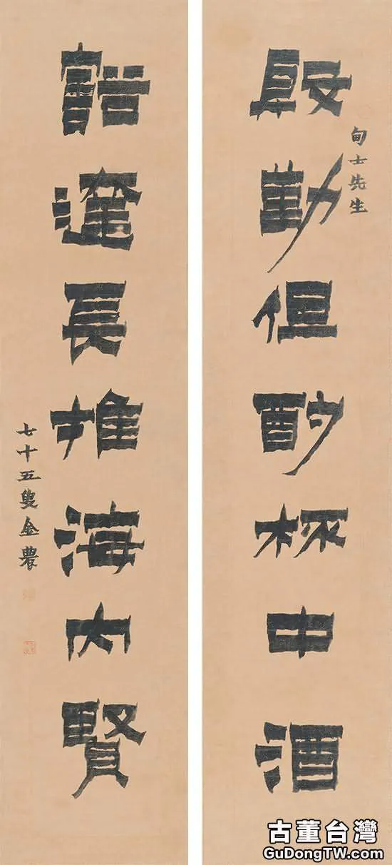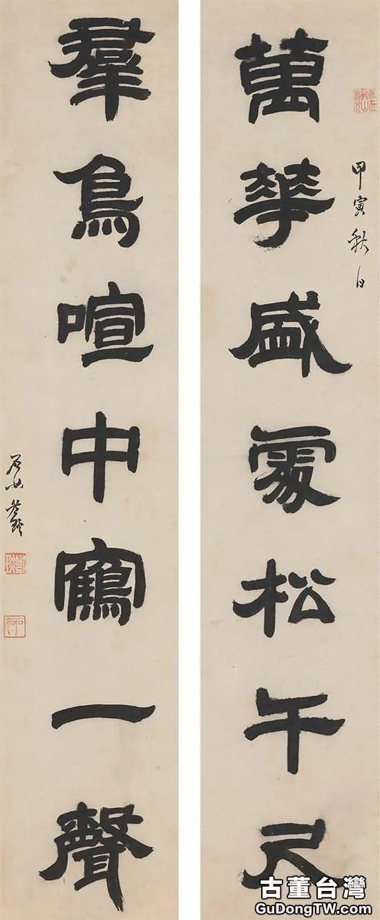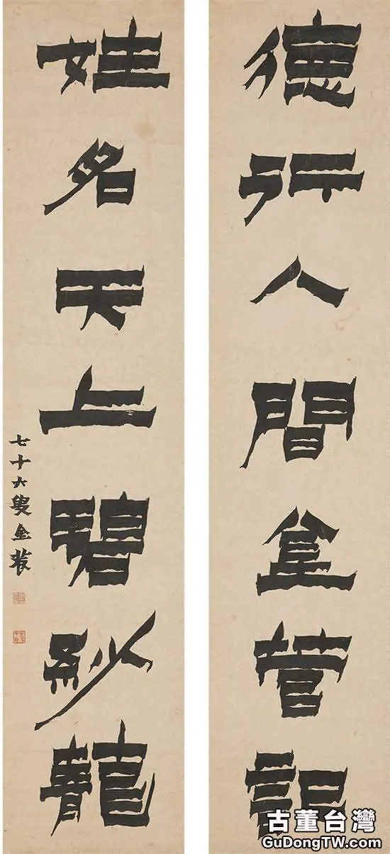 七言聯,為作者離世當年所書,但見通篇間錯落有致、筆體參差,不拘常態、涉筆成趣,無疑為金冬心晚年漆書的代表作品。