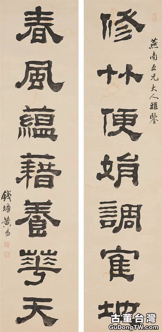 黃易隸書七言聯《修竹便娟調鶴地,東風蘊藉養華天》