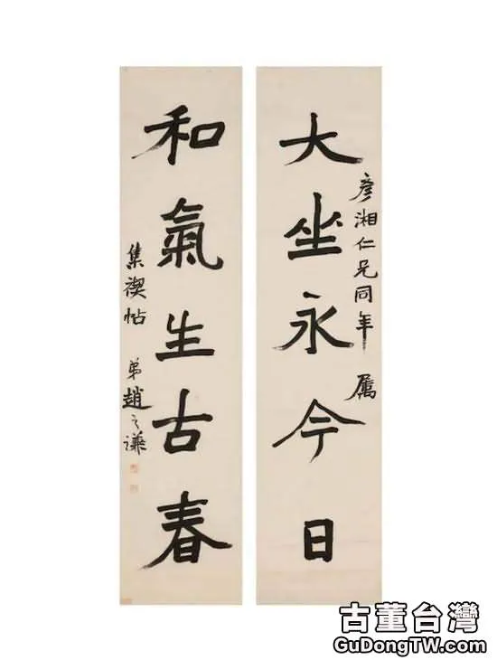 彼時凡學書者,大抵都從顏魯公一體入手,趙之謙自不例外。《顏家廟碑》筆力莊重寬博,結體圓勁渾厚,嚴於法度,的確是學習楷書的理想範本。然結合館藏上款為“彥湘”者的“大坐永今日,和氣生古春”真書五言聯,竟全無顏書蹤跡可尋而令人平添疑竇。根據這個現象,或可作如下推想:首先,以趙氏之機敏好學,在習書上不可能專蹈一體專事一家,從此聯的筆法結字看,似更接近柳公權一體剛健峻拔的書寫特徵。儘管從行徑上說柳自顏來,但畢竟顏、柳皆各有自家特徵在。次之,此聯雖屬趙氏前期所書,但觀其初呈穩健狀,便可知決非弱冠時之作。另外,從作者具款所涉禊帖一詞得知,趙之謙彼時正關注於“二王”書法體系。