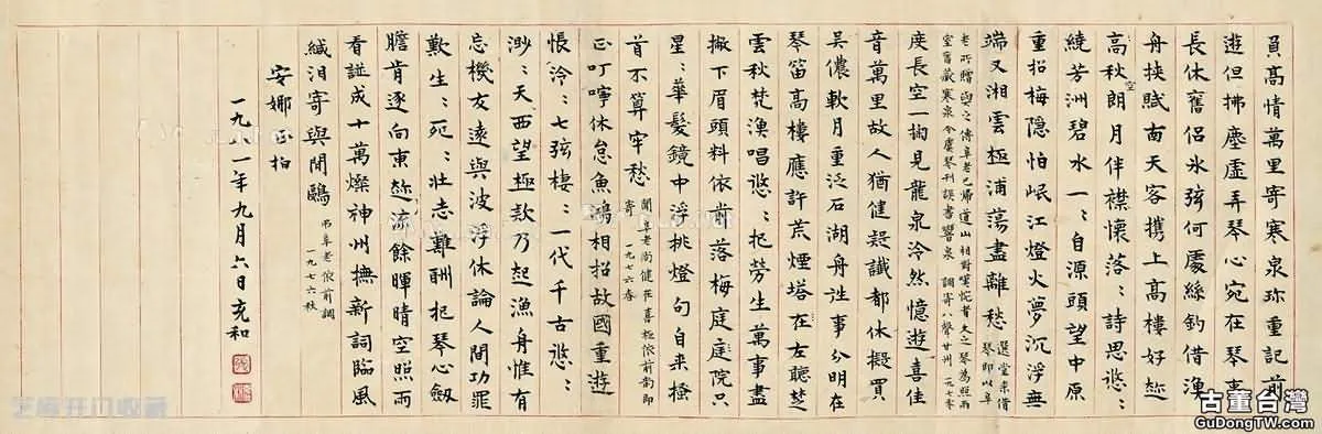 識文:負高情、萬里寄寒泉,珍重記前游。但拂塵虛弄,琴心宛在,琴事長休。舊侶冰弦何處,絲釣借漁舟。挾賦南天客,攜上高樓。好趁秋空朗月,伴襟懷落落,詩思悠悠。繞芳洲碧水,一一自源頭。望中原、重招梅隱,怕岷江燈火夢沉浮。無端又、湘雲極浦,蕩盡離愁。選堂來借琴,即以阜老所贈與之。傳阜老已歸道山,相對歎惋者久之。琴為照雨室舊藏。寒泉,今虞琴刊誤書響泉。一九七零。