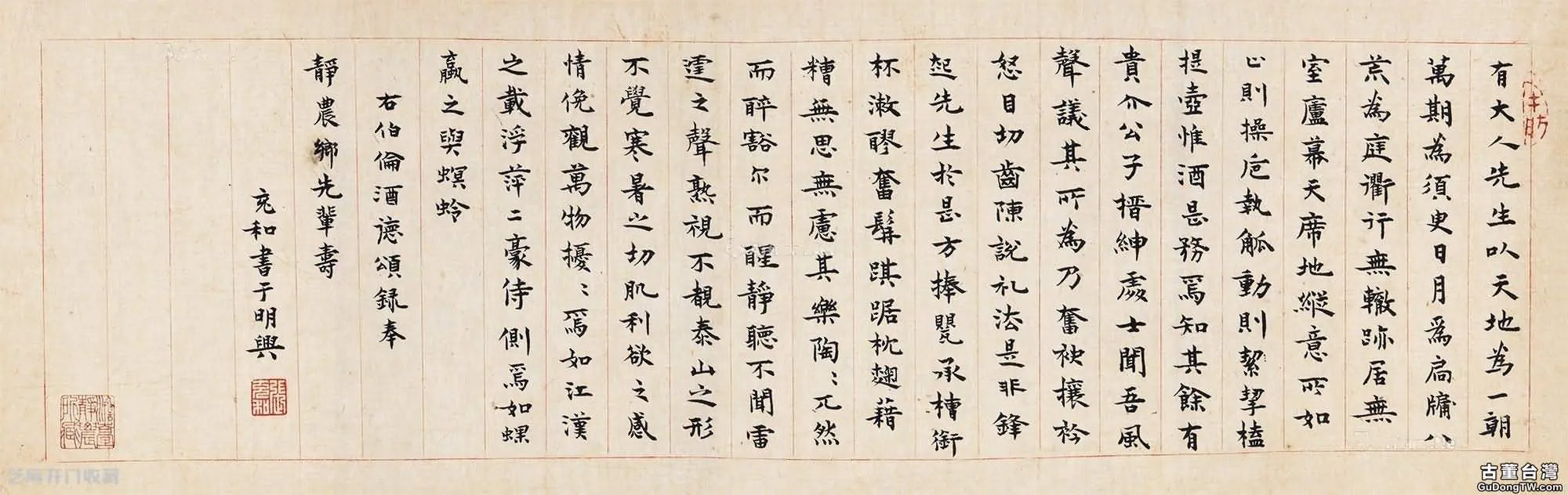 鈐印款識:款識:右伯倫《酒德頌》。錄奉靜農鄉先輩壽。充和書於明興。