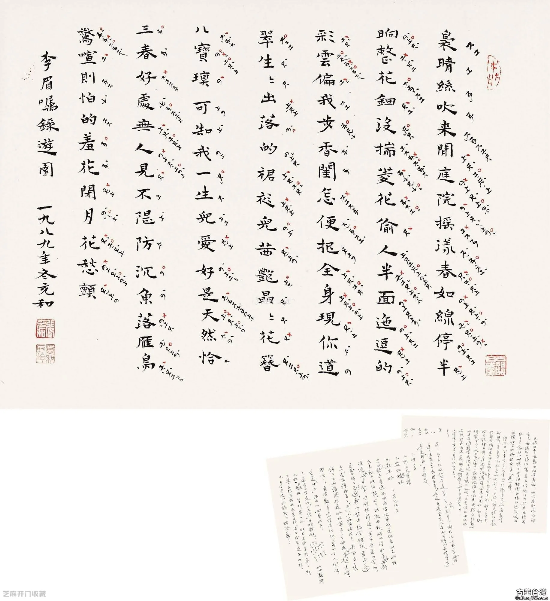 6:1989年作張充和楷書《遊園》工尺譜,尺寸:書法40×55厘米;信札21.5×28厘米×2,估價:HKD 80,000 ~ 120,000,成交價: HKD 330,400 ,成交時間:2019.10.08,拍賣公司:中國嘉德國際拍賣有限公司,拍賣專場:中國嘉德香港2019秋季拍賣會。