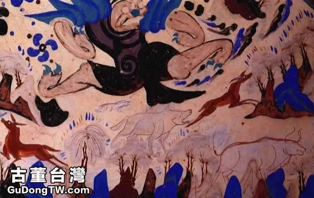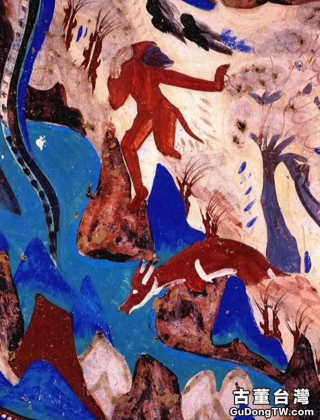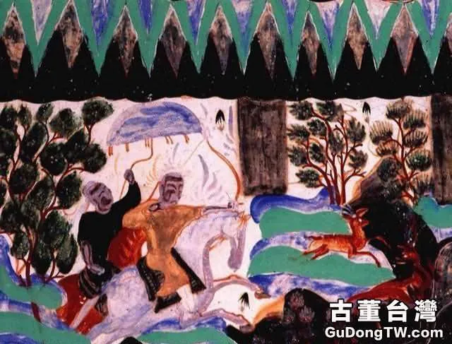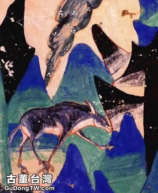 這是腅子本生故事畫中國王出遊射獵的場面。左上角一隻野羊四條腿集中站立於山尖上,誇張中含有真實,趣味橫生。