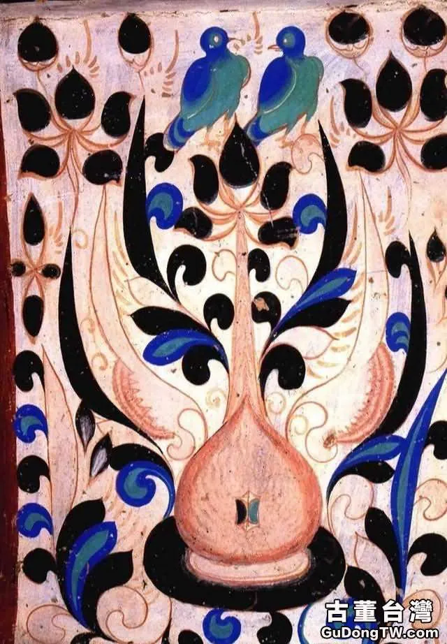 這是繪在望板圖案中的一對鴿子,鴿子站在中央上部一朵盛開的蓮花上,羽毛以綠、青二色暈染,產生寶石藍的效果,色感相當逼真、優美。