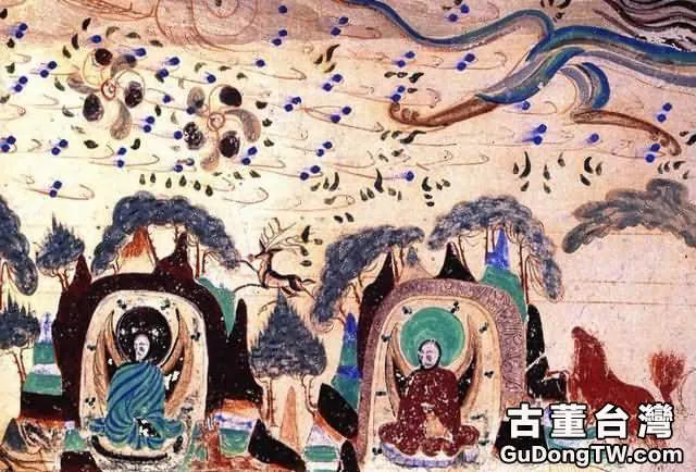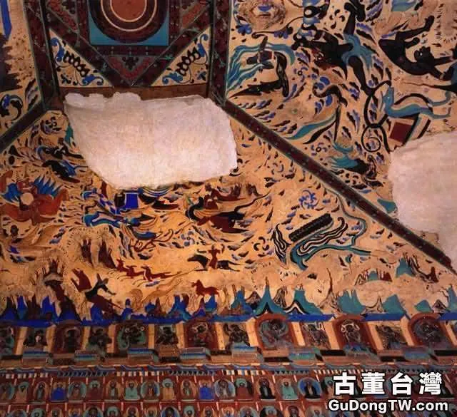 整個窟頂四坡的內容表現的是佛、儒、道關於天上人間的觀念。上部表示了“天上”的各種神話人物和神異動物。最下端是以自然界表示“人間”,有起伏連綿的山巒,山巒間的狼、羊、野牛、狐狸等野生動物出沒。