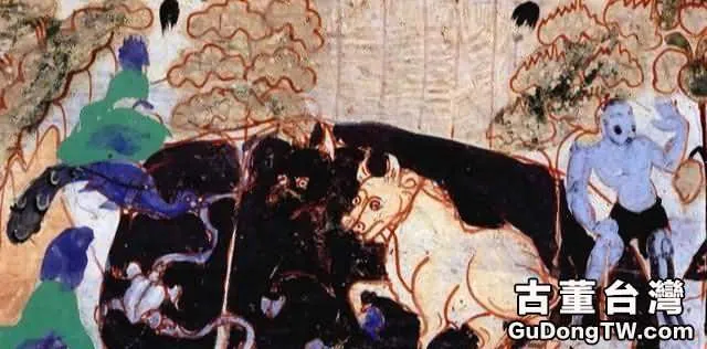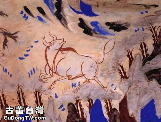 畫面中受驚的野牛,邊逃邊回首。畫師們僅僅用概括簡練的速寫勾勒出野牛的動態神情,逼真傳神。充分表現了作者繪畫技巧的嫻熟,從這個圖中表明了早至南北朝時期,畫師對於野牛結構的認識已經達到了較高的水準。