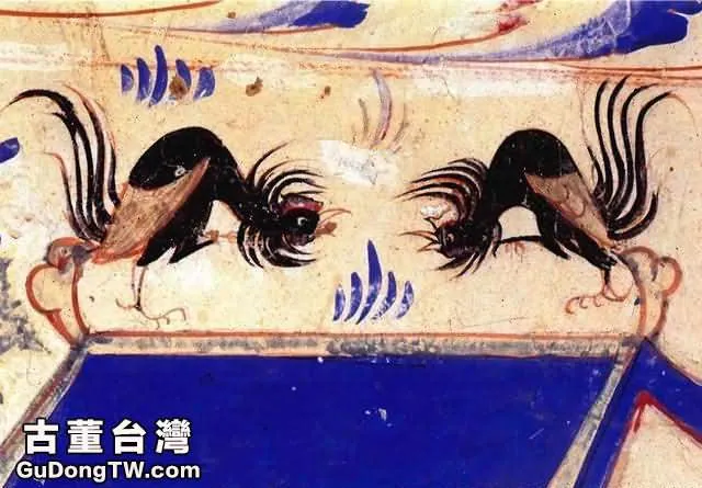 這幅鬥雞圖畫在五百強盜成佛故事畫屋頂上,與故事內容無直接聯繫,只是作為比喻烘托強盜與軍隊爭鬥的氣氛。這是敦煌壁畫中唯一一幅鬥雞圖,在稍早的嘉峪關晉墓壁畫中也曾出現過鬥雞圖。