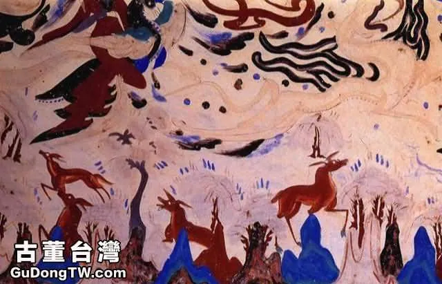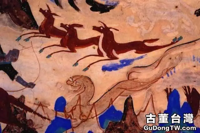 整個在表示人間的山林中,有野牛、野豬、虎、黃羊、鹿、馬等,畫面中生動傳神,特別是獵黃羊和獵猛虎的場面,動感更加的強烈。這是敦煌早期動物畫的傑出代表。