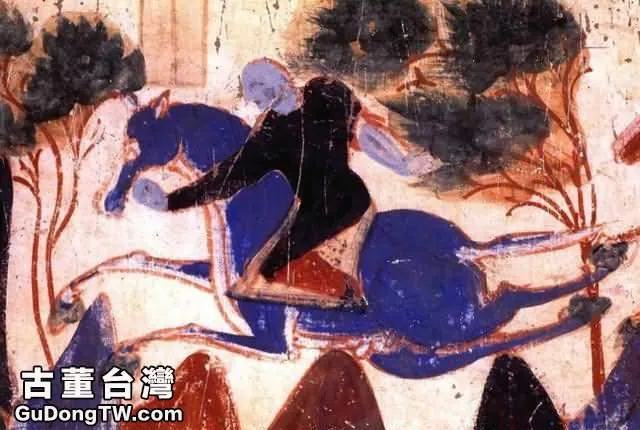 這是兩位兄長見薩埵王子捨身飼虎,急忙策馬回宮報信的情景。馬的形象是嘴細長,頭部和臀部豐碩,瘦腕大蹄。