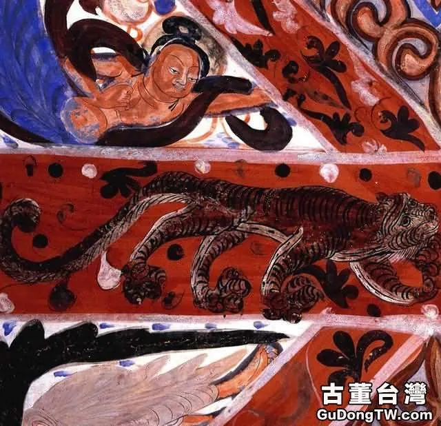 將虎紋畫在窟頂的平碁圖案上,是敦煌壁畫中僅有的一個孤例。其造型風格使我們聯想到漢晉時期一些石雕線刻上的虎紋線畫。