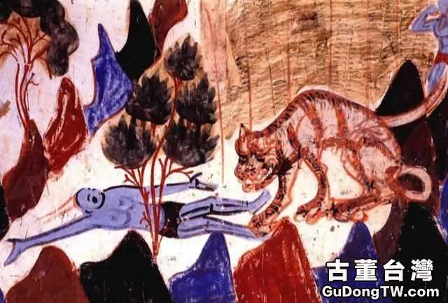 薩埵太子本生故事畫中突出刻畫老虎飢餓至極,而對捨身飼虎的王子,連吃的力氣都沒有,因而滿面愁容。