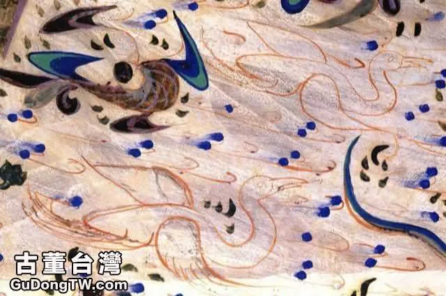 這兩隻比翼齊飛的白鶴,繪於窟頂,是一幅用赭色線起稿而未施丹青的白描。天空中蓮花、忍冬、流雲、流星等或流動,或者旋轉,增添了畫面的動感。整個窟頂除了飛鶴之外,無不敷彩,可能畫家有意利用白色的底子來表現白鶴所致。