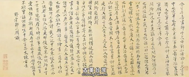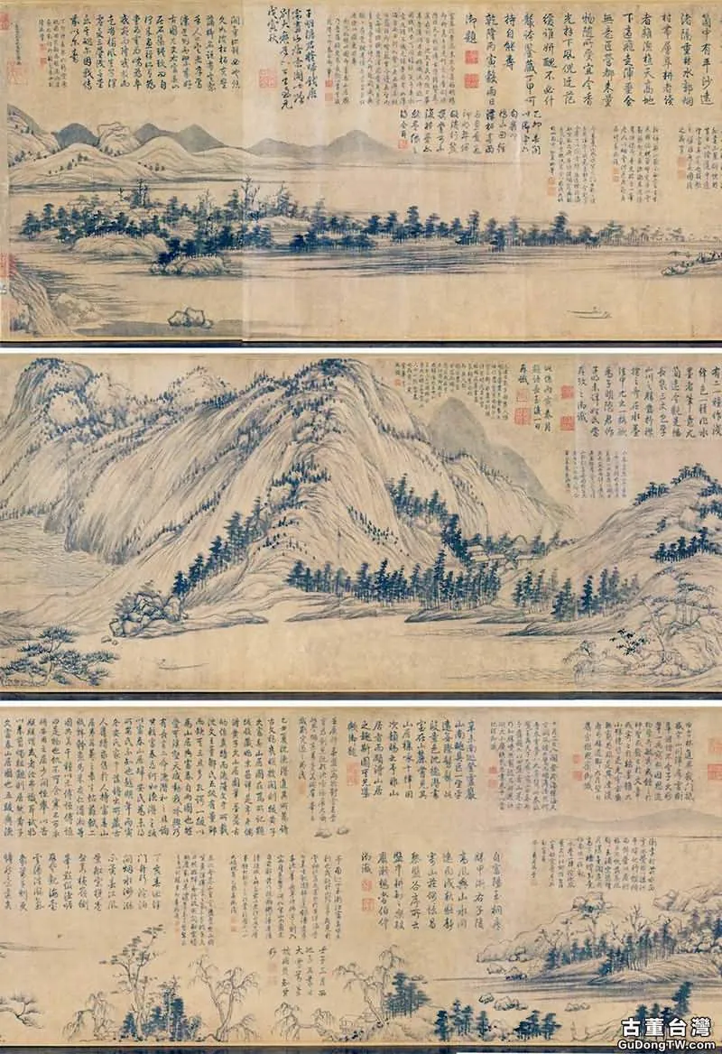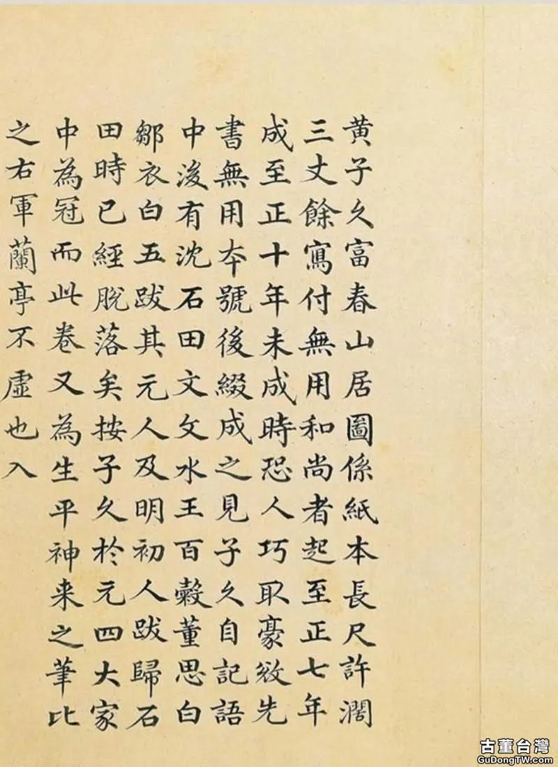 此圖描寫富春江兩岸秋景,筆法上取董、巨,又自出新意,多用披麻皴,干筆皴擦,叢樹平林多用橫點,林巒渾秀,似平而實奇,整個畫面,似融有一種仙風道骨之神韻。這便是《富春山居圖》。此圖經明沈周、文彭、周天球、董其昌、鄒之麟等題記。鄒之麟在題跋中稱此圖「筆端變化鼓舞,右軍之蘭亭也,聖而神矣!」明清許多畫家都從《富春山居圖》中得到啟示,影響深遠。