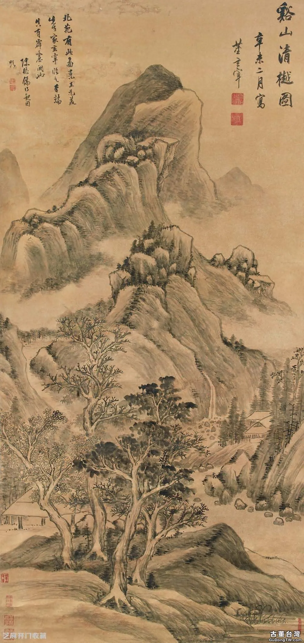 鈐印款識:款?識:溪山清樾圖。辛未二月寫,董其昌。
