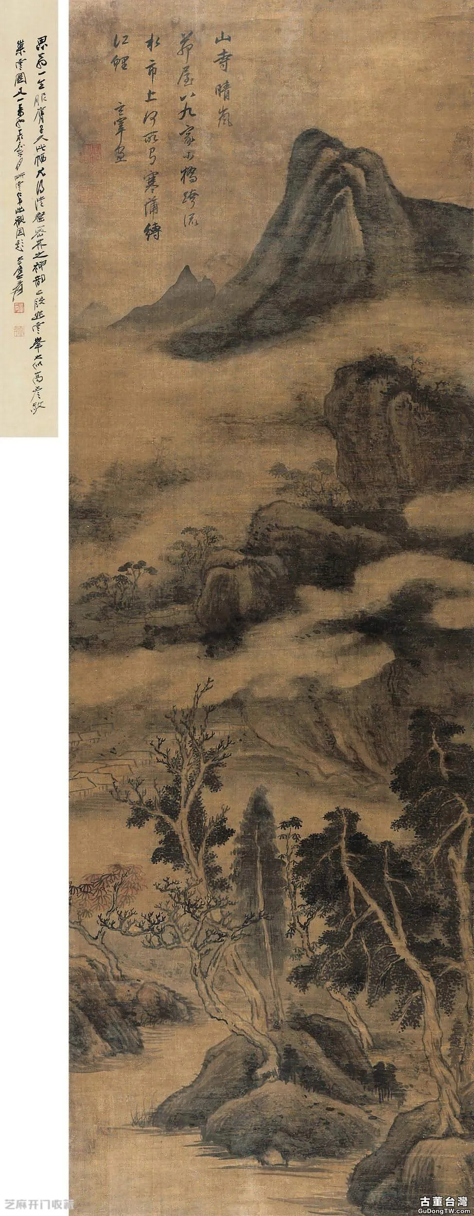 鈐印款識:題識:山寺晴嵐。茆屋八九家,小橋跨流水。市上何所有,寒蒲縛江鯉。玄宰畫。