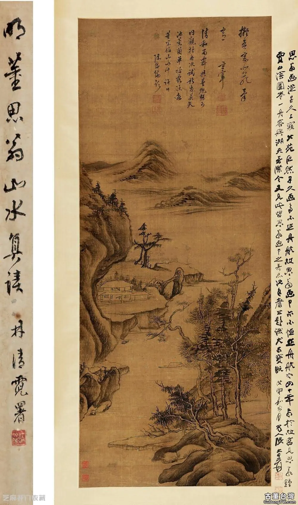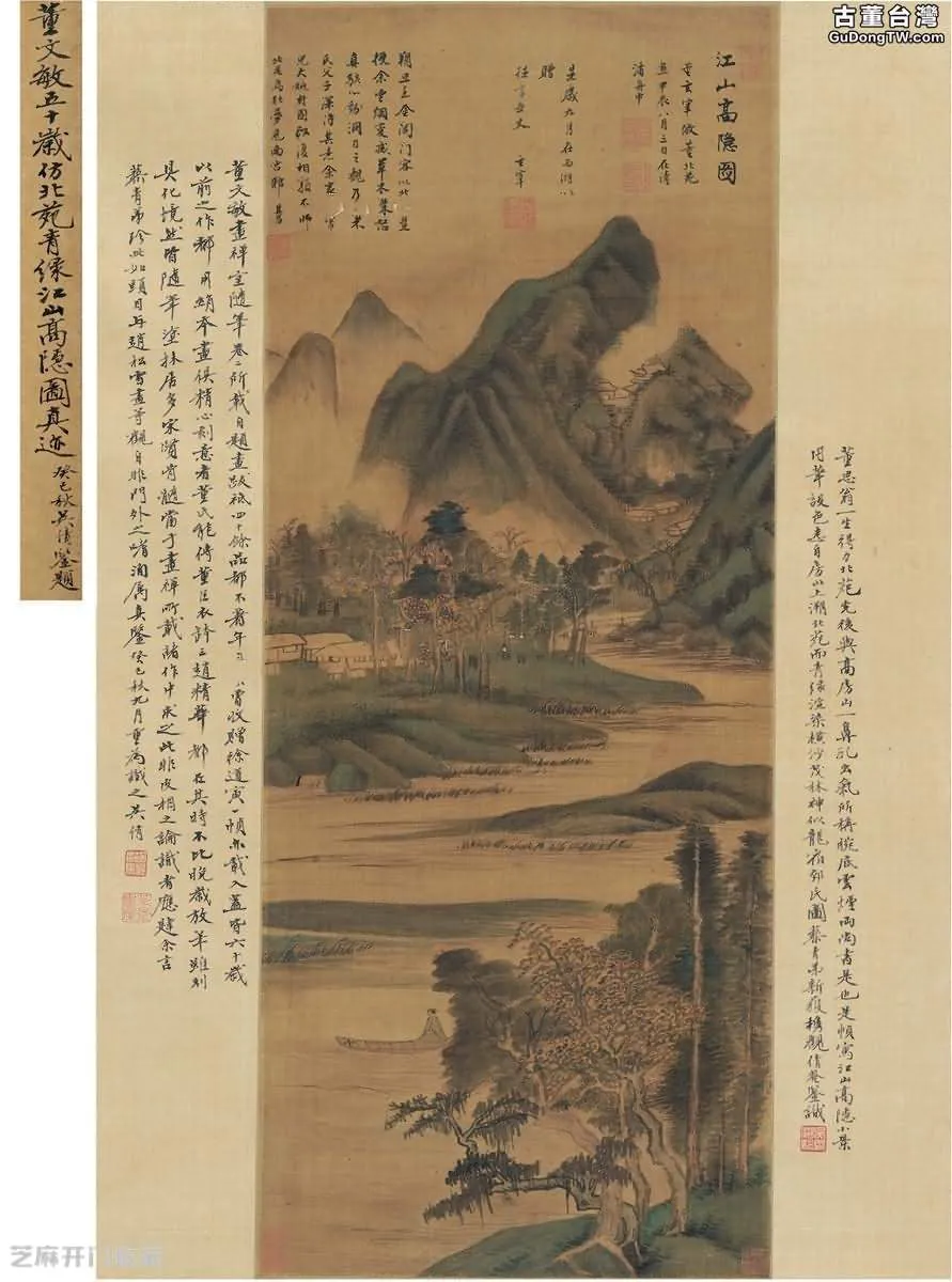 鈐印款識:款識:1. 江山高隱圖。董玄宰仿董北苑畫,甲辰八月三日在清浦舟中。鈐印:董其昌印(白) 太史氏(朱) 畫禪(朱)