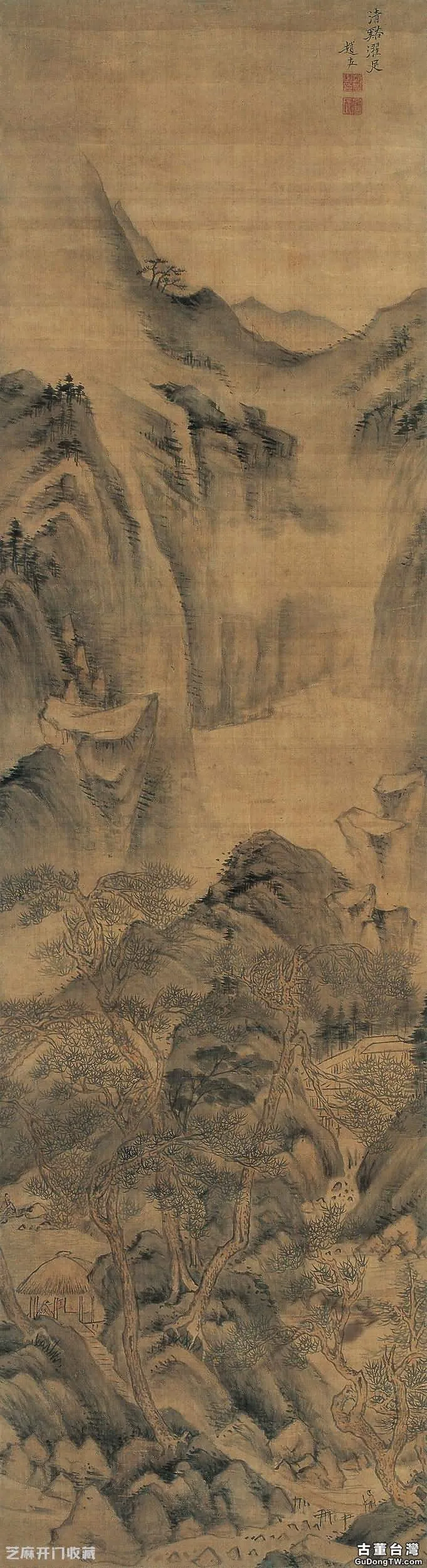 題跋:1. 董思翁一生得力北苑,先後與高房山一鼻孔出氣,所稱腕底雲煙兩尚書是也。是幀寫江山高隱小景,用筆設色悉自房山上溯北苑,而青綠渲染、橫沙茂林神似龍宿郊民圖。藜青弟新獲攜觀,倩庵鑒藏。鈐印:吳湖颿印(白)