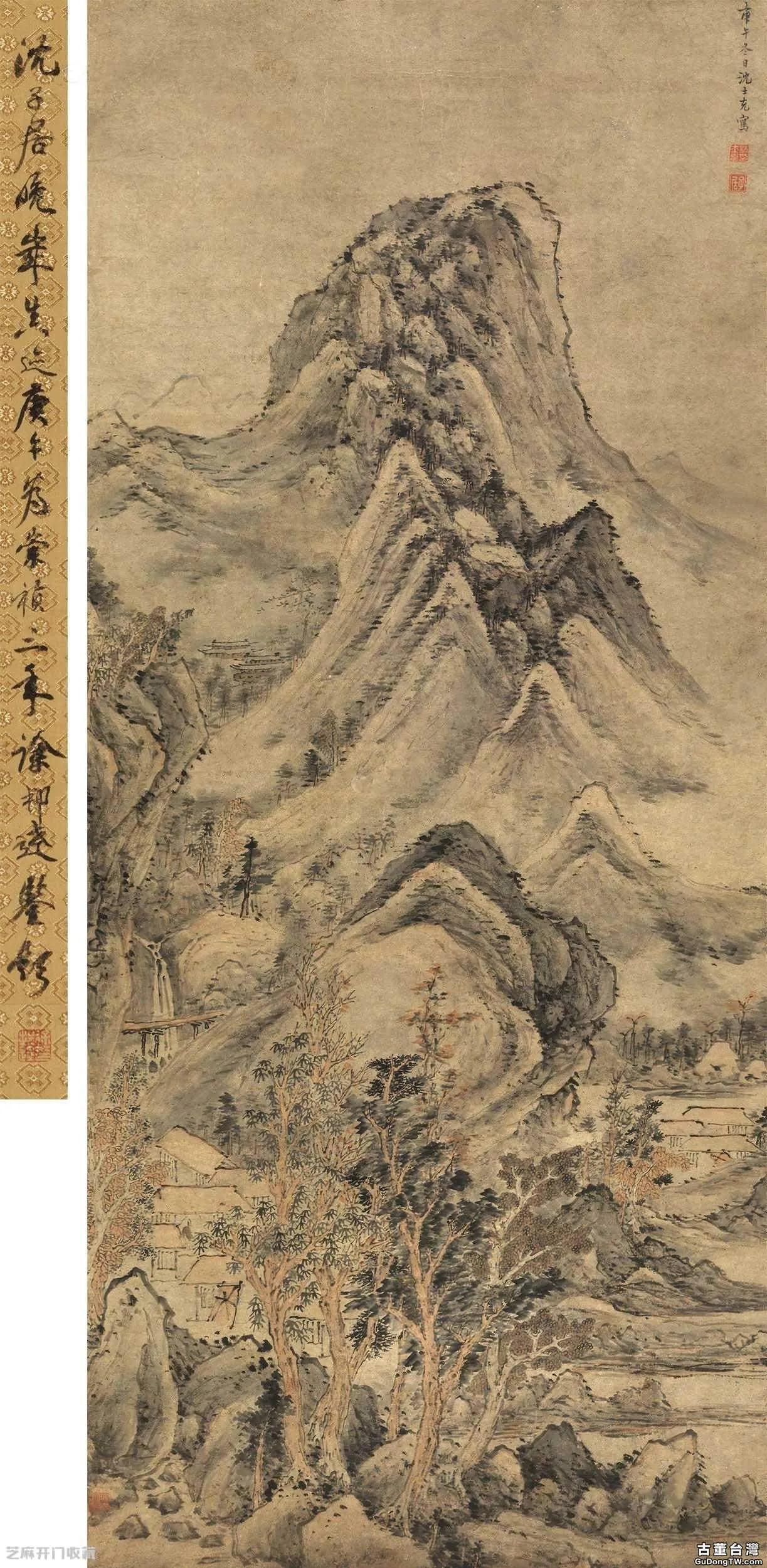 3:董其昌1604年作江山高隱圖立軸,尺寸:73.5×29.5厘米,估價:RMB 5,000,000 ~ 7,000,000,成交價: RMB 6,900,000 ,成交時間:2016.06.26,拍賣公司:西泠印社拍賣有限公司,拍賣專場:2016春季拍賣會。