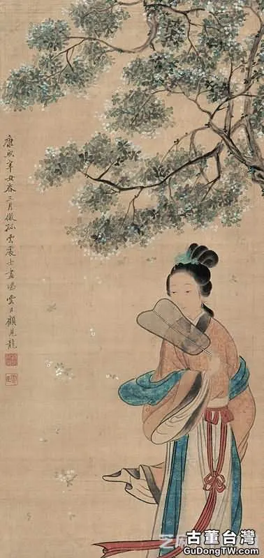 圖6:仕女圖 立軸 設色絹本, 拍賣成交價格估計:RMB 30,000-50,000,最終成交價格:RMB 42,560, 拍賣專場:廣東省古今拍賣有限公司 2009秋季古今藝術品拍賣會, 拍賣成交時間:2009-11-29, 尺寸:77×37cm。