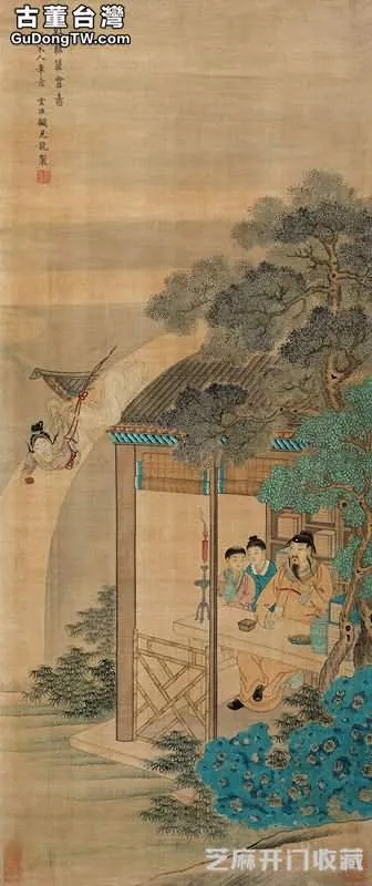 圖2:讀書圖 立軸 紙本設色, 拍賣成交價格估計:RMB 200,000-300,000,最終成交價格:RMB 198,000, 拍賣專場:北京九歌國際拍賣股份有限公司 2005秋書畫藝術品大型拍賣會, 拍賣成交時間:2005-12-18, 尺寸:108×52cm。