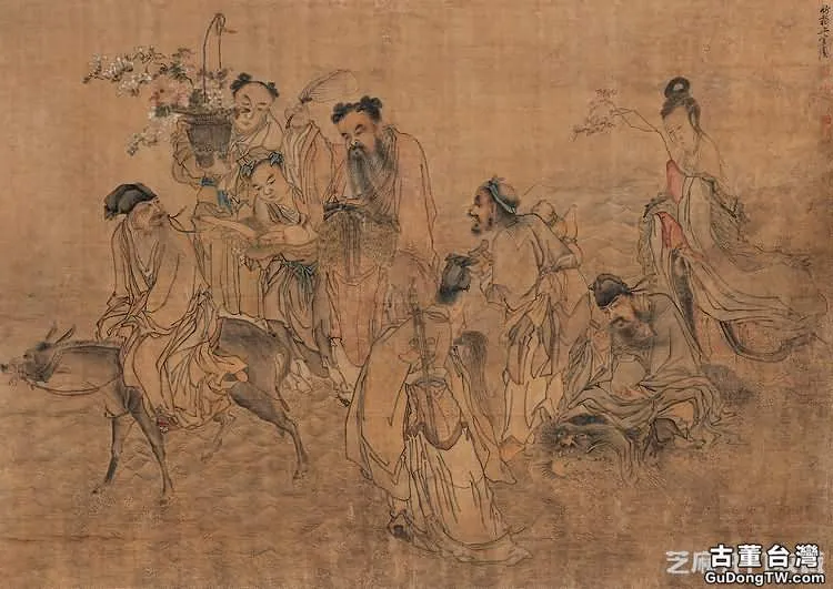 這幅作品中正是嚴冬時節,雪花飄飄,寒風凜冽。萬物凋敝,松柏仍然碧翠,籠上一層白紗。湖面漂泊著幾隻漁舟,小橋上一人執傘前行,挑夫背著行李緊隨其後。幾間簡陋的茅草屋臨水而築,屋內一名高士倚著寒窗悠然自得地賞雪,對岸的農人披著霜雪,急急忙忙地走在歸家的路上。2.《八仙渡海圖》