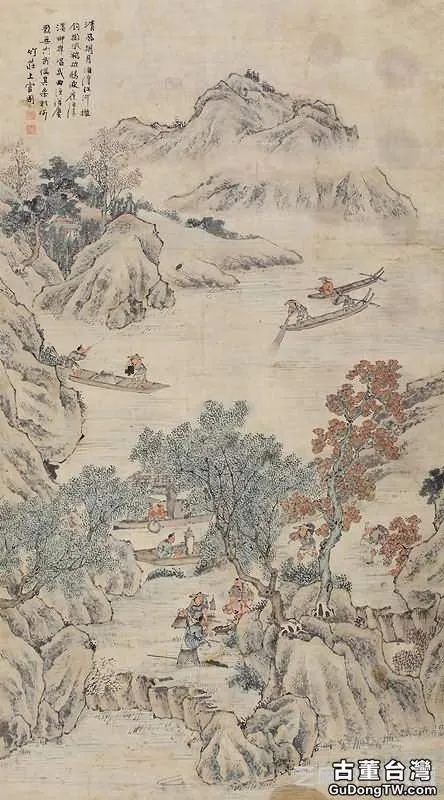 圖8:漁樂圖 立軸 設色紙本, 拍賣成交價格估計:RMB 30,000-50,000,最終成交價格:RMB 48,300, 拍賣專場:北京亨申世紀拍賣有限公司 2014年秋季藝術品拍賣會, 拍賣成交時間:2014-08-23, 尺寸:143×78cm。