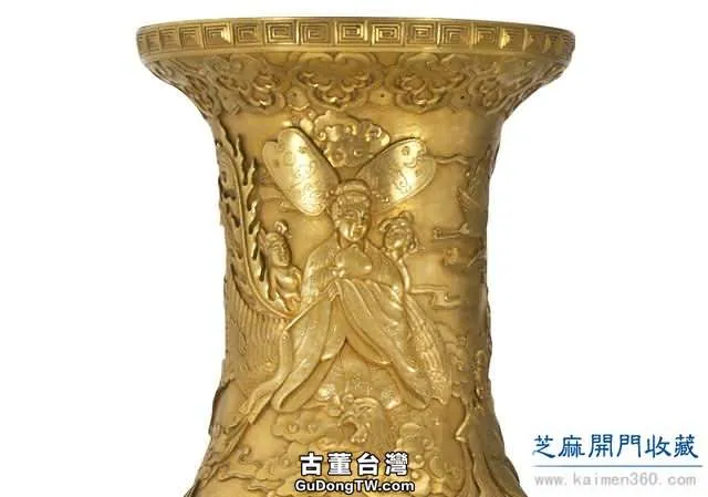 此瓶碩大無比,通體鎏金。山川花木,雲海飛禽,主題人物全以雕瓷技法表達。整器氣魄迫人,巍峨壯觀,令人不敢迫視,但細膩之凸雕又使人不能不趨近細細欣賞。