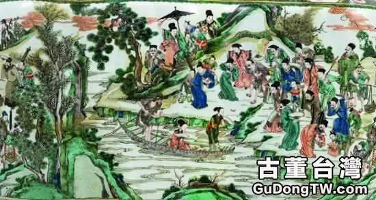 此原為洛陽橋故事中觀音巧取金銀以助蔡學士一節。畫面中蔡襄攜僕騎馬從山後而出,山前場地頗開闊,人群熙熙攘攘擠在江邊,即有豪紳鄉賢,又有市井民夫、乞丐走卒,皆是手持金銀元寶,或做欲投擲之態,或正取金銀之姿,又有多人交頭接耳,熱鬧非凡。江中有花船一隻,上有一老船夫掌篙,一紅衣妙女坐於船中,旁立一黃衣綠褂者,似為侍女。船中灑滿了從江岸上投來的金銀。人群外,呂祖攜樹精隱觀,或架雲浮在空中,或藏身出在山後。用彩用色熱烈鮮亮,繪畫毫髮爽利,構圖奇幻富麗,應屬同時期的康熙五彩上等細作。