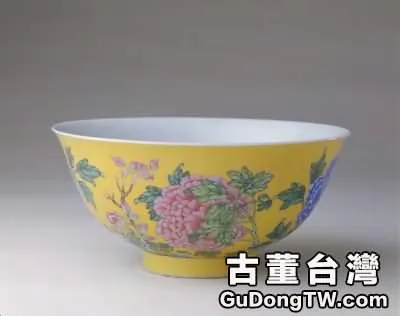 黃地琺琅彩牡丹紋碗,清康熙,高7.2cm,口徑15.2cm,足徑5.7cm。