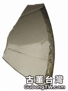 圖5的碗片是定窯扣金,扣金與扣銅放在一起立馬就能分辨清楚。此邊的扣金寬度為0.6厘米,碗內扣的金皮寬度為0.8厘米。初看此片,美妍雅致,細觀更覺與眾不同,其制胎細薄,釉色淨潤,色象牙白,碗內突出筋兩條,更顯力度增強,氣韻不凡。