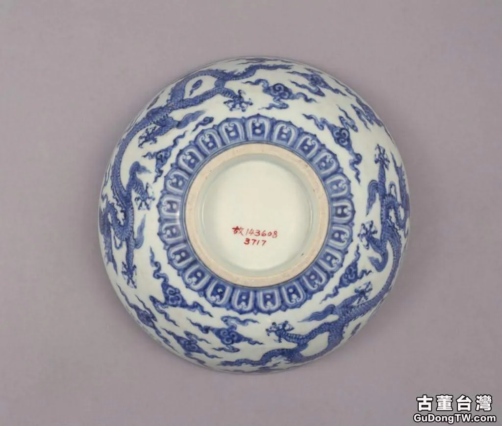 缽(音bō)口微斂,弧腹,平底。通體青花裝飾。外壁從上至下依次繪海水紋、雲龍紋、蓮瓣紋。內底青花雙線圈內署青花楷體「大明宣德年制」 雙行六字款。外底素胎無釉。