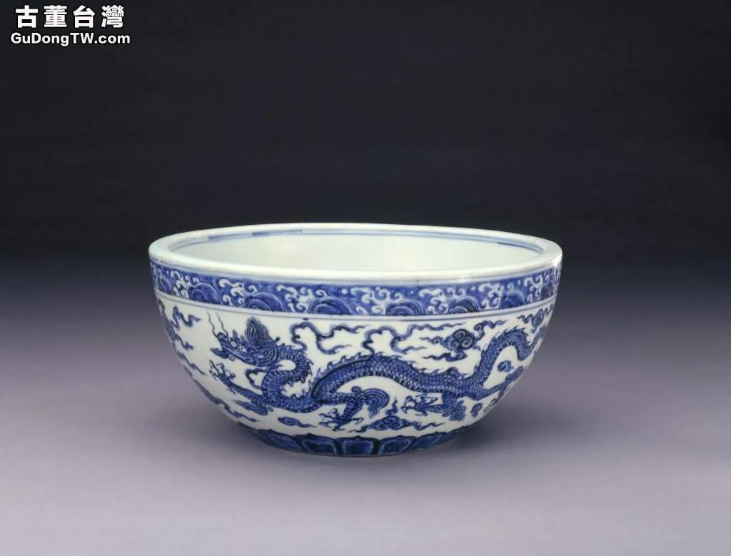 青花海水龍紋缽,明宣德,高12cm,口徑26.5cm,足徑12cm。