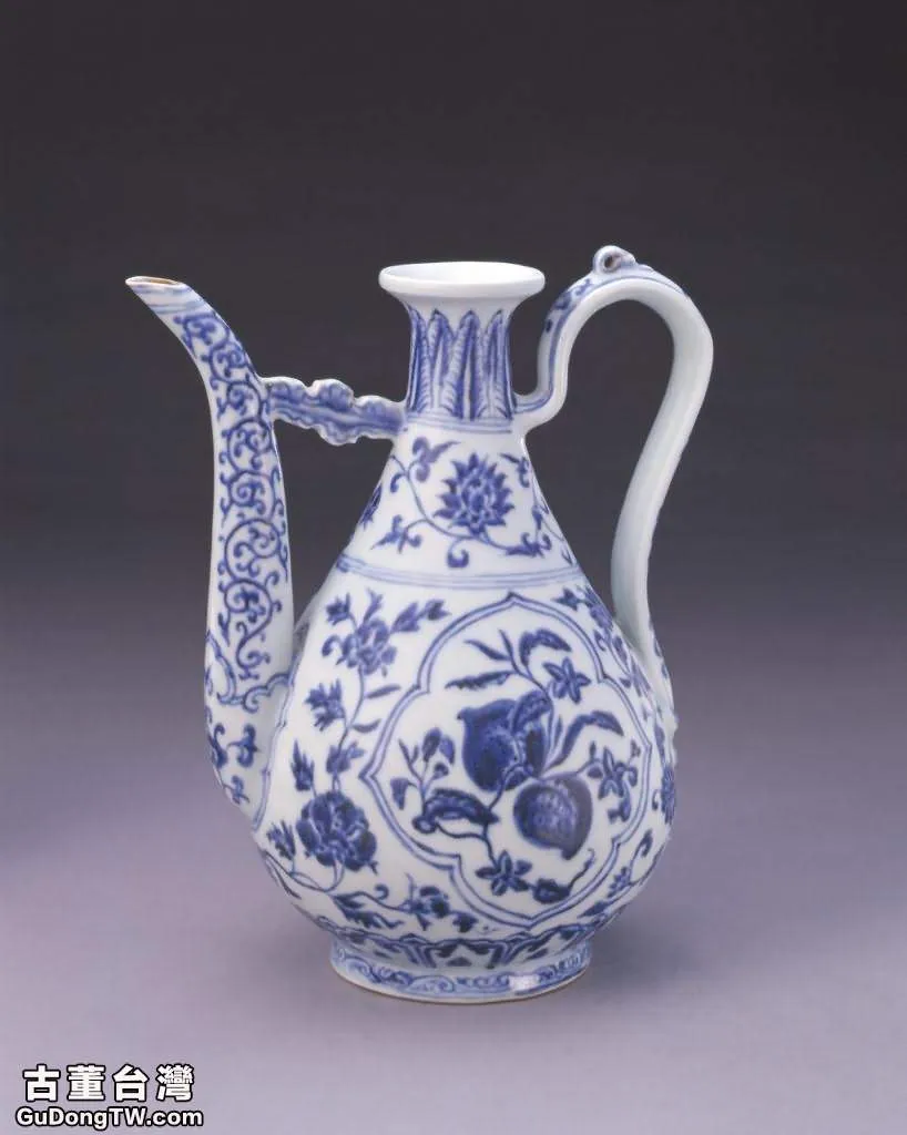 壺體為玉壺春瓶式,撇口,細頸,垂腹,圈足。一側有彎形長柄,柄上有小系,另一側附長流,流與頸間有雲板相連。流、柄、口高低相若。壺蓋扣合於壺口,蓋面拱起,上飾寶珠鈕,可與柄上的小系用繩相連以防壺蓋滑落。通體青花為飾,頸部繪蕉葉紋,下飾纏枝蓮花一周,腹部兩面有菱形開光,一面開光內繪折枝桃,一面繪枇杷果,開光間繪纏枝花卉。蓋面及近底處均繪蓮瓣紋,流與足牆均飾忍冬紋,柄飾朵花紋。底白釉,無款。
