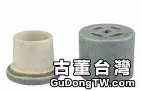 這件爐鈞釉熏香盒(圖1),通高5、口徑3.4、底徑5厘米;全器造型小巧,由盒身(圖2)和盒蓋兩部分組成,蓋與盒身為嵌套式結構,扣合後呈圓筒狀。蓋面(圖3)上開有五個鏤孔,組成鏤空錢紋裝飾,盒身中部施白釉,盒蓋與盒底施爐鈞釉,釉色青綠,並滿佈月白色和淡紅色斑點,似魚籽狀,又似水中的氣泡,各色斑點間相互交融,流動變幻,具有清代爐鈞釉典型特徵。