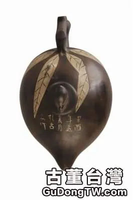 圖中所示的這件欽州窯桃形壺,高12.5厘米,通長18.4厘米,底徑5.8厘米。壺呈壽桃形,前有一短小的流口,與壺身融為一體,並不顯得突兀;後置一柄,柄作桃枝狀,又在柄與壺身的連接處刻畫四片桃葉,桃枝和桃葉的裝飾與桃形壺身巧妙的配合,和諧而統一;壺上配有一個很小的壺蓋,壺口旁開一細槽,需蓋沿突起處對準壺口細槽方能蓋合,轉動壺蓋後即與壺身合為一體,即使倒置,壺蓋亦不會掉落;壺流一側的下腹部,仿壽桃的特徵製成微凹狀,惟妙惟肖;全器呈烏金色,部分有黑色紋理,木光,古樸而雅致。在桃形壺的肩部還刻行書「辛酉年孟春月於古安作」十字。經鑒定,這件欽州窯桃形壺為民國時期生產,再根據壺上銘文「辛酉年孟春月……作」,可知此壺生產於1921年農曆正月,而欽州古稱安州,故銘曰「於古安作」,由此更可確定其為欽州窯產品。