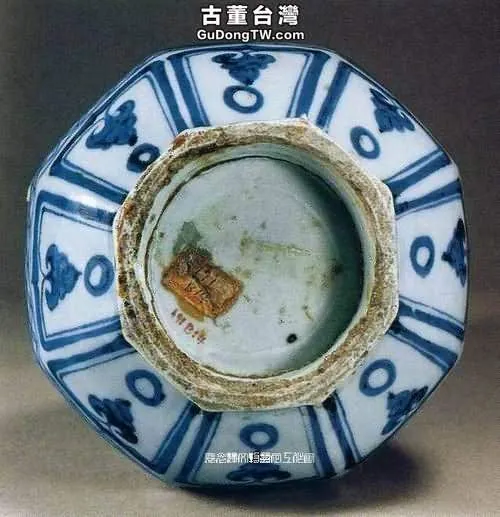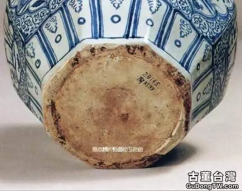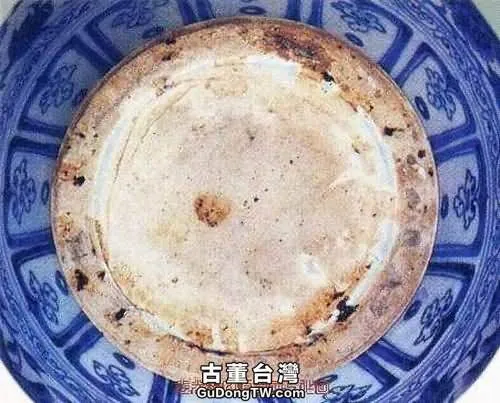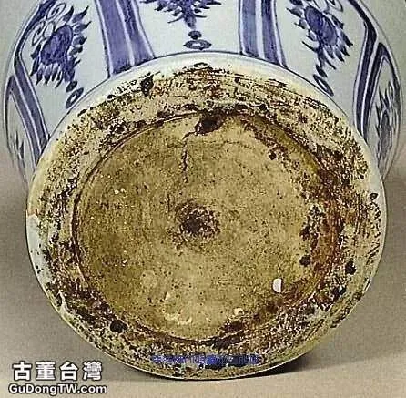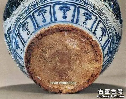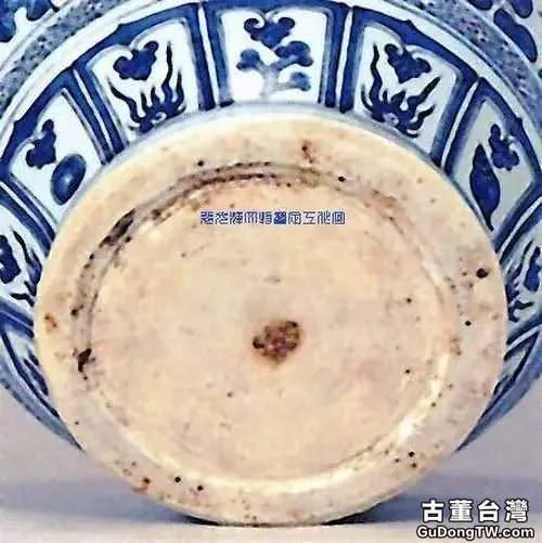 10、釉斑:有一部分砂底元青花瓷器底部有釉斑。釉斑或多或少,大小不等,形狀不規則,一般呈青白釉色。為什麼會特地加上這些並不美觀的釉斑呢?經觀察,我發現這些釉斑的分佈有一定規律:即經常分佈在圈足內牆根和外底邊沿的交接處,外底中心區域。這不就是經常會出現裂縫的地方嗎?由於胎泥的問題(如熟化程度不夠)、成型的問題(如拉坯不勻)、瓷坯乾燥環境問題(查有關資料,元代尚沒有「晾曬池」這種玩意),所以生坯在乾燥過程中的坼裂現象當比較常見,這些釉斑即是用來填補瓷坯縫隙的。再觀察釉斑呈圓形的很少,許多都是呈不規則長條狀的,又可證實我的推測。另外這些釉斑都很厚,也能說明此道理。現代一些元青花仿品,也效仿釉斑,但因為作偽者不明元代人在器底加釉斑的用意,或者任意揮灑,在不可能產生坼裂的部位也亂點一通,毫無道理可言。或者分佈整齊、具裝飾意味,不知古人是在需要的地方(也就是有坼裂的地方)才加釉斑的,並沒有裝飾意圖,哪有這樣整齊的分佈?