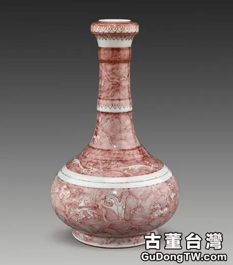 此瓶器形挺拔端莊,裝飾手法新穎,紅白二色交相輝映,海濤中騰躍的大小二龍,有「蒼龍教子」之寓意。清雍正釉裡紅海水龍紋瓶,高35.5厘米,口徑7.2厘米,足徑13.5厘米。
