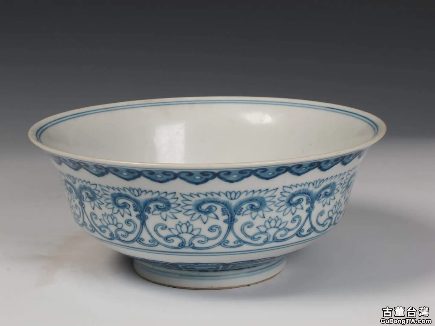乾隆青花貫套紋瓷器碗高:7.1 口徑:18.5 底徑 :8.2,瓷器胎質細膩,紋飾精美,畫工一流,通體施白釉,釉質滋潤透明。釉下青花紋飾,口沿二道弦紋,碗底心青花纏枝忍冬紋一圈,內心繪八角貫套石榴花紋。外口沿飾如意頭一周,腹部繪貫套石榴花一周。