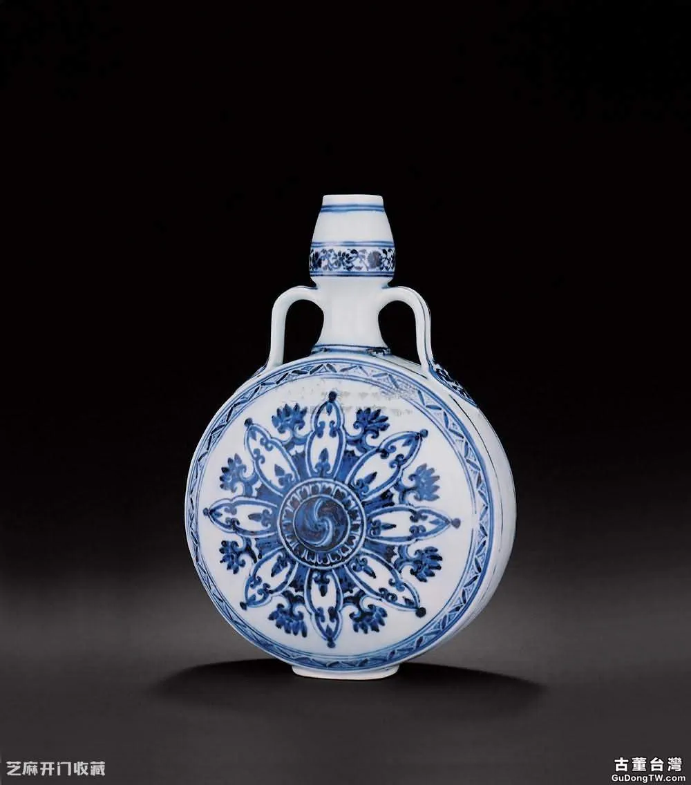 此青花葫蘆扁壺,造型及紋飾之創造靈感源自中東地區,開中國瓷器新風尚。所繪寶相輪花,或與中東頗有淵源,唯口沿下一圈纏枝花卉與雙耳下方之折枝花卉為中國紋樣。幾何紋飾規整嚴謹,搭配花卉溫婉流麗,更添氣韻與美感。