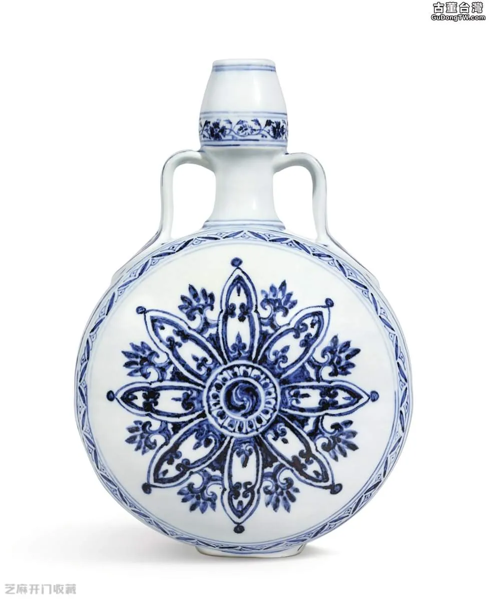 3:明永樂青花寶相花紋綬帶葫蘆扁壺,尺寸:31.5厘米,估價:HKD 7,000,000 ~ 9,000,000,成交價: HKD 12,720,000 ,成交時間:2018.10.03,拍賣公司:香港蘇富比拍賣有限公司,拍賣專場:2018年秋季拍賣會。